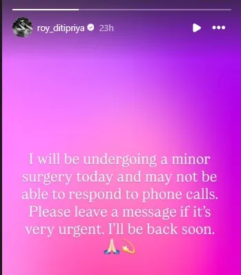 হাসপাতালে ভর্তি হওয়ার আগে সোশ্যাল মিডিয়ায় দিতিপ্রিয়া লিখেছিলেন, 'আজ আমি একটা ছোট অস্ত্রোপচারের জন্য হাসপাতালে ভর্তি হচ্ছি। সেই জন্য আমি হয়ত কারও ফোনের উত্তর দিতে পারব না। খুব প্রয়োজনীয় কিছু হলে দয়া করে আমাকে মেসেজ করবেন। আমি যত দ্রুত সম্ভব উত্তর দেব।'
