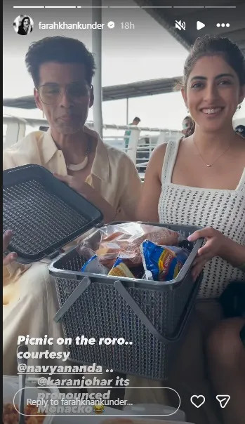 ফারাহ খান আরও কয়েকটি ভিডিও পোস্ট করেছেন যেখানে দেখা যায় তিনি, করণ জোহর ও নব্যা নভেলি নন্দা মুম্বই থেকে এম২এম ফেরিতে আলিবাগ যাচ্ছেন। ক্যাপশনে ফারাহ লেখেন, 'RoRo-তে করণের ডে আউট!' প্রত্যুত্তরে করণ লেখেন, 'আমাকে আমন্ত্রণ জানানোর জন্য ধন্যবাদ। জীবনের এক অন্যতম অভিজ্ঞতা।' অমিতাভের নাতনি নব্যা আবার তাঁর পিকনিক বাস্কেট খুলে দেখান যার মধ্যে ছিল বিস্কুট, চিপস সহ আরও অনেক মুখোরোচক আইটেম।