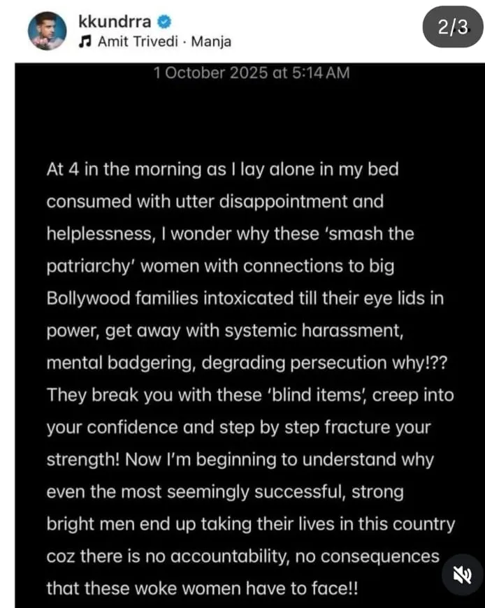 তিনি আরও যোগ করেন 'আমরা কঠোর পরিশ্রম করি, পরিবার থেকে দূরে থাকি, কিন্তু কেউ আমাদের পাশে দাঁড়ায় না। তোমার প্রাণবন্ত ব্যক্তিত্ব ধীরে ধীরে ম্লান হয়ে যায় আর শেষে তুমি একটা ‘জাস্টিস ফর...’ হ্যাশট্যাগে পরিণত হও। ভোর ৪টের সময় যখন বিছানায় একা শুয়ে থাকি আমি ভাবি কেন এই ‘smash the patriarchy (স্ম্যাশ দ্য প্যাট্রিয়ার্কি) মহিলারা যাঁরা ক্ষমতা আর পরিচিতির নেশায় কী ভাবে মানসিক নির্যাতন করেও পার পেয়ে যায়। তারা তিলে তিলে অন্যকে শেষ দেয়। এখন আমি বুঝি কেন সফল পুরুষও এই দেশে আত্মহত্যা করে। কারণ এই ধরনের মহিলাদের হাত থেকে নিস্তার নেই।'