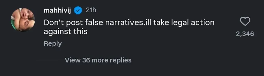 তিনি দাবি করেছেন, এই খবর সম্পূর্ণ ভুয়ো। বিবাহবিচ্ছেদের খবর একেবারে ভিত্তিহীন। সোশ্যাল মিডিয়ায় সুর চড়িয়ে কড়া ভাষায় আক্রমণ করেছেন মাহি ভিজ। এইধরনের খবর প্রচারের আলোয় এলে আইনের দ্বারস্থ হবেন জয় ঘরনি। স্পষ্টভাবে জানিয়ে দিয়েছেন, 'ভুয়া গল্প ছড়াবেন না। আমি আইনি ব্যবস্থা নেব'। এই ঘটনার একদিন আগেই জয় ভানুশালির ইনস্টাগ্রাম পোস্টে মেয়ের একটি ছবি পোস্ট করেন। সেখানে মাহি মন্তব্য করেন, 'তারা সবচেয়ে কিউট।' সঙ্গে তিনটি লাল হৃদয়ের ইমোজি।