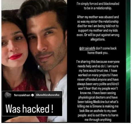 Feroze Khan-Dr Zainab: তারকাদের জীবন যেন খোলা বই! ব্যক্তিগত জীবন নিয়ে নিত্য নতুন গসিপ তো পেজ ৩-এর হট কেক। সম্প্রতি রটে যায়, দ্বিতীয় স্ত্রীর সঙ্গে সংসার ভাঙছে পাক অভিনেতা ফিরোজ খানের। বুধবার রাতে ফিরোজ খানের ইনস্টা স্টোরির একটি পোস্ট ঝড়ের গতিতে ভাইরাল হয়ে যায় সোশ্যাল মিডিয়ায়। যা দেখে উদ্বেগ প্রকাশ করে অনুরাগীরা। দ্বিতীয় স্ত্রী ড. জায়নাবের সঙ্গে দাম্পত্যে সমস্যা সংক্রান্ত একটি ইঙ্গিতপূর্ণ পোস্ট। কিছুক্ষণের মধ্যেই সেটি আবার সরিয়েও দেওয়া হয়। আচমকা এমন ঘটনার নেপথ্যে বিশেষ কোনও কারণ? ফিরোজ জানিয়েছেন তাঁর ইনস্টাগ্রাম অ্যাকাউন্ট ‘হ্যাক’হয়েছিল। এই বিষয়টিকে সামনে রেখে সোশ্যাল মিডিয়া ইউজারদের সতর্ক করেছেন অভিনেতা।