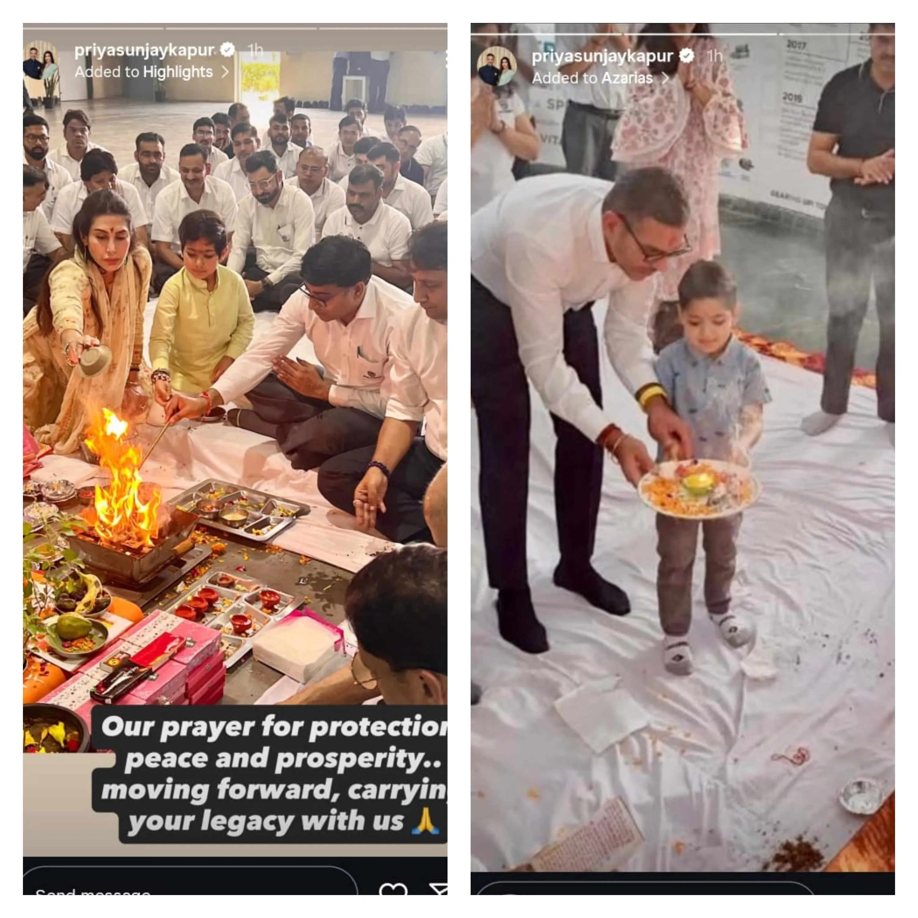 সোশ্যাল মিডিয়ায় সেই মুহূর্ত নিজেই ভাগ করে নিয়েছেন। শুক্রবার প্রিয়া তাঁর ইনস্টাগ্রাম স্টোরিতে পূজোর কিছু ঝলক শেয়ার করেছেন। একটি ছবিতে দেখা যাচ্ছে, ছেলে আজারিয়াসকে সঙ্গে নিয়ে পূজো করছেন। অন্যটি ছিল পুরনো একটি ছবি যেখানে প্রয়াত স্বামী সঞ্জয় কাপুর বিগত বছরগুলিতে তাঁদের ছেলেকে নিয়ে একই পূজা করছিলেন। এই ছবিগুলোর সঙ্গে প্রিয়া লিখেছেন, 'আমাদের প্রার্থনা রক্ষা, শান্তি ও সমৃদ্ধির জন্য। তোমার উত্তরাধিকার বহন করে আমরা এগিয়ে যাচ্ছি।'